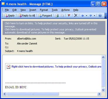 In the last few days quite a few spam emails of the type shown below, landed into my inbox. Clearly the message is contained in an image, which of course I don't allow Outlook to download.