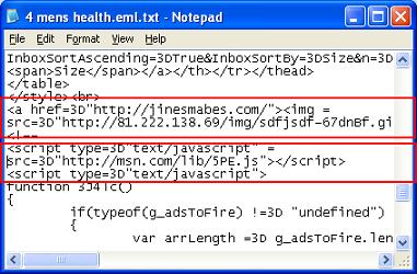 Next we take a closer look at the raw email. As we already know, all the "information" is contained within an image. Additionally the email also includes loads of garbage in an attempt to trick filtering. Unfortunately the combination of garbage and content is in this case succeeding to trick IMF. Here is a little snippet, highlighting some interesting content including an HTML image and a Java Script.