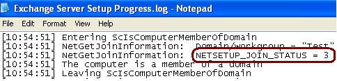 If you think the server is a domain member and Exchange Setup still fails, then check the value of NETSETUP_JOIN_STATUS at the Exchange Server Setup Progress.log file as shown in the figure below: