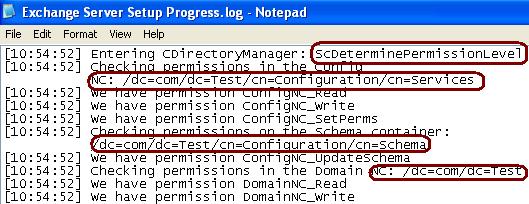 Both Exchange 2003 and Exchange 2007 return a value for the Final Set of Permissions. The Final Permissions Set value was shown earlier in the main figure A and is also shown in the Exchange Server Setup Progress.log file below. This value is 0XF0C0E0E0 and is returned when Exchange Setup has full permissions on all the NCs in Active Directory. In Exchange Server Setup Progress.log file, the value is shown here: