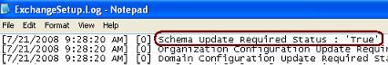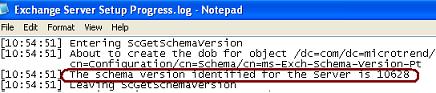 For Exchange 2007, the attribute ms-EXCH-Schema-Version-Pt at /dc=com/dc=Test/cn=Configuration/cn=Schema contains the schema version. You need to check the rangerUpper value. Exchange 2007 setup log just displays the schema version but the entry doesn't clearly tell whether it requires updating the schema or not. Instead, this is logged in the ExchangeSetup.log file as shown below: