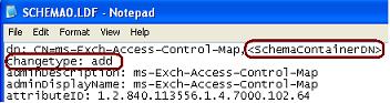 The first entry is the DN that contains the full AD path where the Setup will import the contents of this file. Look at the path, the entry is not complete. We have the <SchemaContainerDN> tag that needs replacement. Apart for that we also need to tweak the changetype value.