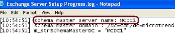FIGURE B.11 - Exchange Server Setup Progress.log showing Schema Master Name