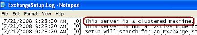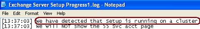 If you're troubleshooting an Exchange Installation in cluster, your first task is to make sure that the cluster is up and running (e.g. Cluster Service is running). If setup has detected that the cluster is operating normally then it will log a message in the ExchangeSetup.Log file as shown in the figure below: