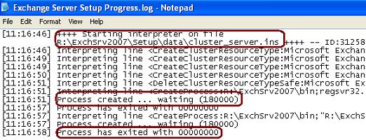 It first executes the CLUSTER_SERVER.UNS file to cleanup any already installed components. Following that CLUSTER_SERVER.INS file is executed to create and register the Exchange Resource Types with the cluster, register the EXCLUADM.DLL with COM+ and Cluster, and bind the Exchange Provider with RPC and the TCP/IP Stack. The Setup executes CLUSTER_SERVER.INS to make sure the Exchange Resource Types are created and registered with the cluster before you are able to create any Exchange-specific resources in the cluster. Setup interprets each line in the file as shown in the figure below:
