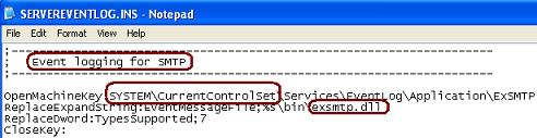 The file contains a key that will be created in the registry and the Event Logging file name (EXSMTP.DLL). The EXSMTP.DLL file is responsible to generate events for the SMTP Service. There are other entries also in the file which Exchange Setup executes to make sure these registry entries are created.