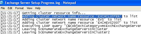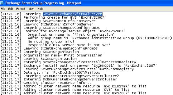 After setup processes all INS files, ScSetupExchangeVirtualServer is executed. This function is responsible to create all the Exchange Resources in the cluster. Let me tell you one thing, this function is completely dependent on the CLUSTER_SERVER.INS file. Only if setup executes CLUSTER_SERVER.INS successfully can Exchange 2007/2003 resources be created. The reason is simple. Setup interprets CLUSTER_SERVER.INS to create and register the Exchange resource Types with the cluster. Only then can the Exchange cluster resources be created.