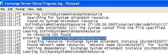 Setup, after adding the Network Name and other dependent resources, starts executing ScCreateSystemAttendantResource as shown in the figure below. You used to create this resource manually but in Exchange 2007 this process changed and does this automatically. This function also sets the dependency on the System Attendant Resource.
