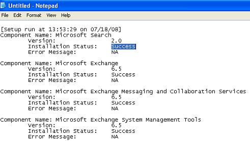 This file contains only this much information. You can see in the above figure, the Installation Status: Success is displayed for the Microsoft Exchange and Microsoft Exchange Messaging and Collaboration Services. That means Exchange 2003 was installed successfully. In case of errors this would also be clearly logged in this file.
