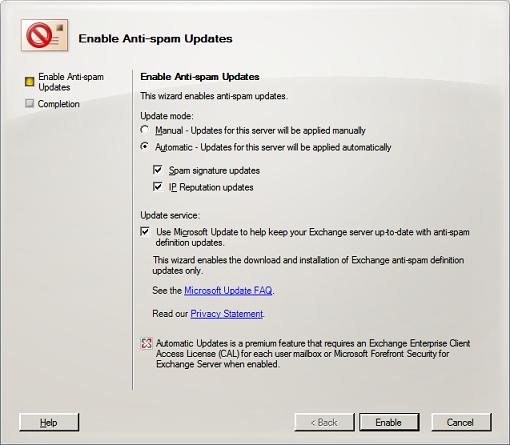 Clicking Disable Anti-spam Updates will immediately disable reception of all updates and at the console the Enable Anti-spam Updates link is displayed. Clicking the Enablement link to turn it back on will launch a wizard that allows us to select which updates to retrieve.