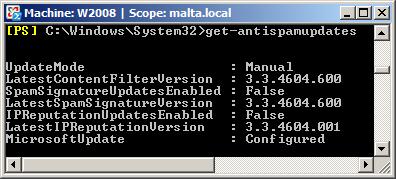 Let's have a look at Get-AntispamUpdates. Here is what we get by running the cmdlet immediately after installing Exchange 2007 SP1 without ever receiving any updates.