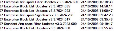If we look closely, we can see a number of IP Block List and Anti-spam Signature updates on the same day. Also note how each update specifies exactly whether it is meant for Exchange Enterprise or Exchange Standard. Indeed, even though both receive the Content Filter updates, separate releases are made for the two Exchange flavours. Lastly each entry of course includes the update version and the release date.
