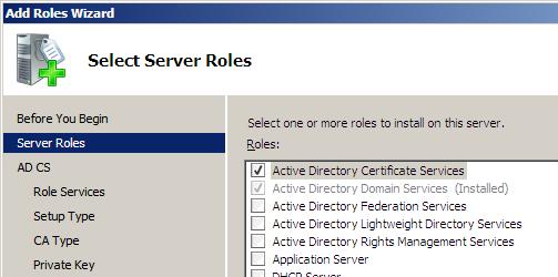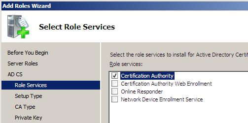 Starting the Wizard we proceed to the Role Services selection. Here we find four services that together are useful in running a complete live PKI. In my case I will only install the Certification Authority that allows me to issue and manage Certificates.