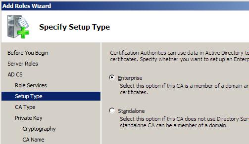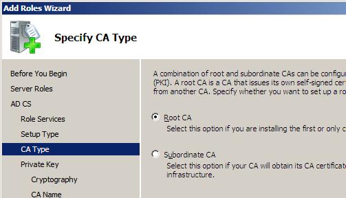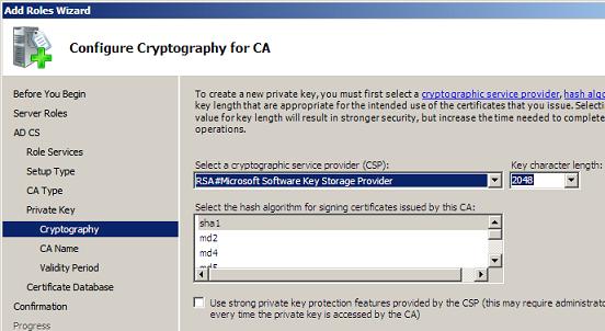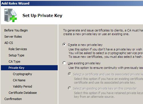 In the steps that follow I choose Enterprise to use Active Directory, Root CA to create an independent PKI and 'Create a new private key'.