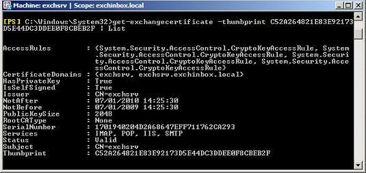 Normally we would only get the last Certificate, here having a thumbprint starting with C52A. The other two Certificates were created on installing the Certification Authority and are not in use by any Exchange services. We take a closer look at this Certificate identifying it using the thumbprint.