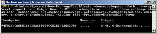 Generating a request involves running the New-ExchangeCertificate cmdlet. This is the part requiring most planning. Here we have to get the names right as discussed in the first part of the article. In my case I used the following cmdlet: