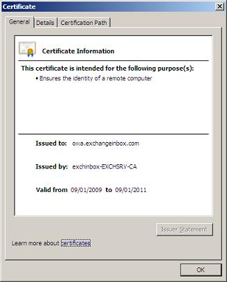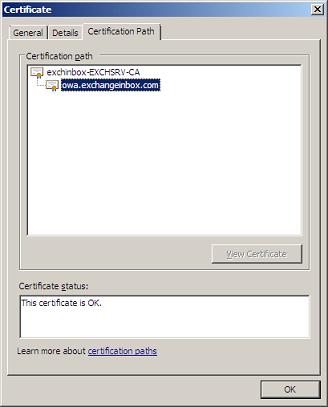 Opening the Certificate we can look at its properties. The General page shows how the owa.exchangeinbox.com Certificate was issued by our newly created private CA. The Certification Path page shows the hierarchical relationship between the Certificate and the CA. This chain could in practice be composed of additional sub-authorities that form part of this chain.