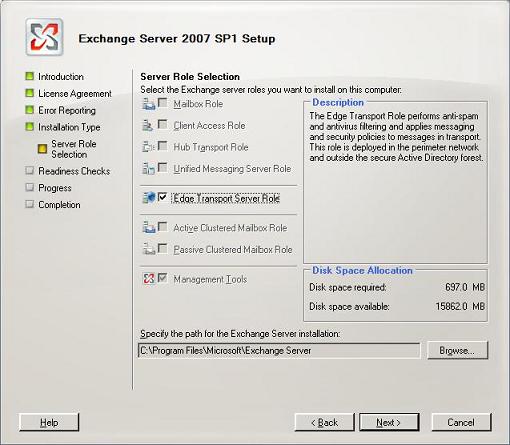Next we looked at the installation requirements. These contribute greatly in making the Exchange 2007 Edge server role DMZ friendly. The requirements include ADAM. This fills up the void left by the lack of the Active Directory service, providing storage for the Edge server configuration. Once all requirements were satisfied, installing Edge was just a matter of selecting the custom installation type and the Edge server role.
