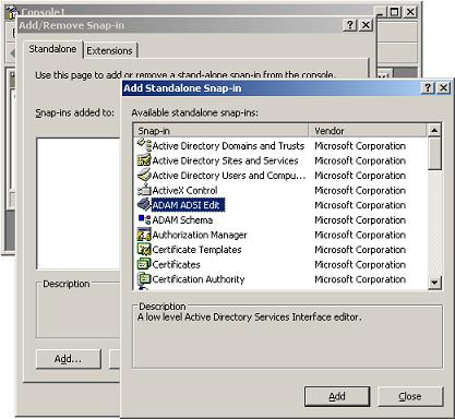 Open, File | Add/Remove Snap-in | Add | ADAM ADSI Edit