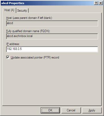 We start from the internal DNS server. This is the one used by the Hub transport. Thus we add an A record for the Edge server named 'abcd'. We add this under the Forward Lookup Zone for exchinbox.local.