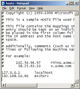 Now we move to the perimeter network and create an A record for the Hub named 'exchsrv'. If the perimeter were running its own DNS server, we would create the A record there, as we did for the internal network. Otherwise we just edit the hosts file located under: