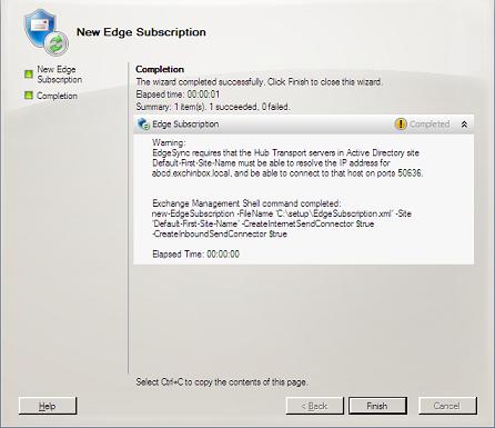 "Creating an Edge Subscription makes the configuration of this Edge Transport server ready to be managed via EdgeSync. Any of the following types of objects that were created manually will be deleted: accepted domains; message classifications; remote domains; and Send connectors. Also, the InternalSMTPServers list of the TransportConfig object will be overwritten during the synchronization process. The Exchange Management Shell tasks that manage those types of objects will be locked out on this Edge Transport server. You must manage those objects from inside the organization and allow EdgeSync to update the Edge Transport server. EdgeSync requires that this Edge Transport server is able to resolve the fully qualified domain names (FQDN) of the Hub Transport servers in the Active Directory site to which the Edge Transport server is being subscribed. Those Hub Transport servers must be able to resolve the FQDN of this Edge Transport server. You should complete the Edge Subscription inside the organization in the next "1440" minutes before the bootstrap account expires."