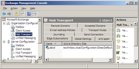 Completing the subscription, we can immediately have a look at the new configuration elements that were created. Under Organization | Hub Transport | Edge Subscriptions we find the registration of the 'abcd' server.