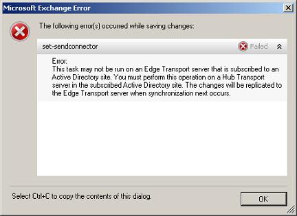 "This task may not be run on an Edge Transport server that is subscribed to an Active Directory site. You must perform this operation on a Hub Transport server in the subscribed Active Directory site. The changes will be replicated to the Edge Transport server when synchronization next occurs."