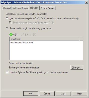 Now let's see what happens when the configuration changes at the Hub Transport. Here at the "EdgeSync - Inbound to Default-First-Site-Name" Send Connector, I configured exchsrv.exchinbox.local as the smart host to be used by the Edge server for inbound emails.
