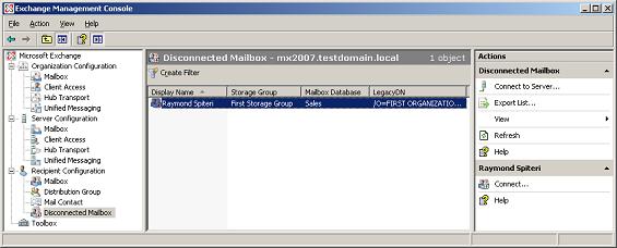 The corresponding cmdlet for this operation is Connect-Mailbox. Below is an example of the cmdlet used to re-connect Raymond Spiteri's disconnected mailbox: