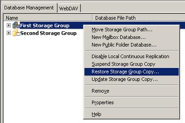2. Right click on the storage group and select Restore Storage Group Copy (as shown in the image below). This will bring up the Restore Storage Group Copy wizard.