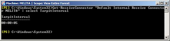 Set-ReceiveConnector "Default Internal Receive Connector MELITA" -TarpitInterval 00:00:10