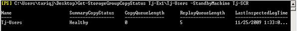 Get-StorageGroupCopyStatus Tj-Ex1\Tj-Users -StandbyMachine Tj-SCR