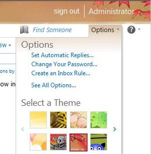 Microsoft brought back UI themes to OWA which allow you to choose a style for the interface that best suits you. By selecting Options from the top right hand corner (as shown in the image below) you can choose from over 20 different themes that will change the top banner and the colour scheme of the Outlook Web App UI.