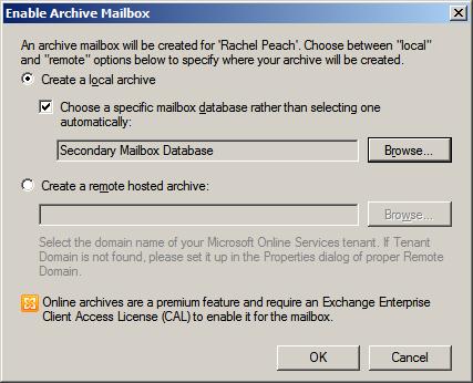 Ability to store a user's Personal Archive on a different mailbox database other than that for the primary mailbox; this should give you flexibility with your storage requirements, make backups simpler and improve access performance. You are given the option to do this from the Exchange Management Console when enabling the Archive. Here is what you get on right clicking on a mailbox name and selecting "Enable Archive...".