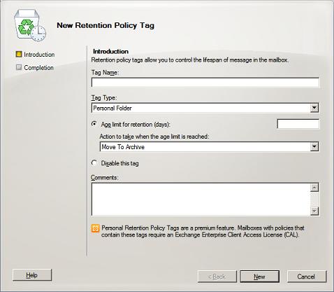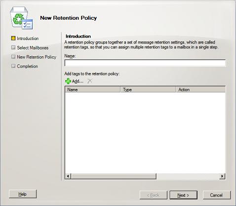 As we will see in a later section, SP1 will allow you to create Retention Policy Tags and Retention Polices from within the Exchange Management Console itself. Previously, Retention Policy Tag and Retention Policy creation was only possible via Exchange Management Shell cmdlets.