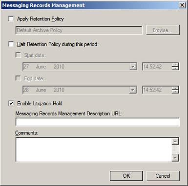 From the EMC you will also be able to manage public folder permissions, configure Database Availability Group settings and set a mailbox to be on Litigation Hold (as shown in the image below).