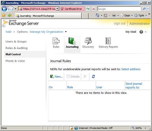 The Exchange Control Panel (ECP) available within the Outlook Web App will allow you to configure the Personal Archive, MailTips, Transport Rules, Journal Rules (as shown in the figure below), Unified Messaging settings, mobile device policies, as well as RBAC roles.