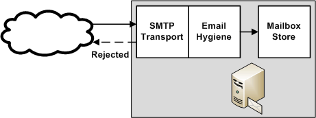 The internet facing SMTP transport will immediately decide between accepting and rejecting emails. The Email Hygiene stage could also advise the SMTP Transport, flagging rejection of spam and malware infected emails. If not rejected the email is delivered to the Mailbox Store. This is the ideal scenario; emails are either rejected or delivered. Retention policies enforced at the Mailbox Store correctly cover all emails.