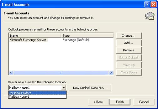 To complete this article I will just document the steps how to configure Outlook to deliver emails to the local Personal Folders.