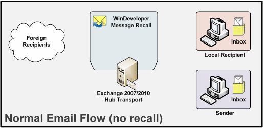 This solution is very different from what Exchange provides. To begin with, WinDeveloper moved message recall processing to the Exchange server transport. The idea here is to block emails before reaching their destination. The process is illustrated in the animation that follows: