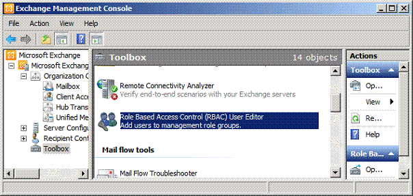 1. Start by opening the Exchange Control Panel. You can launch this from the Exchange Management Console | Tools | Role Based Access Control (RBAC) User Editor