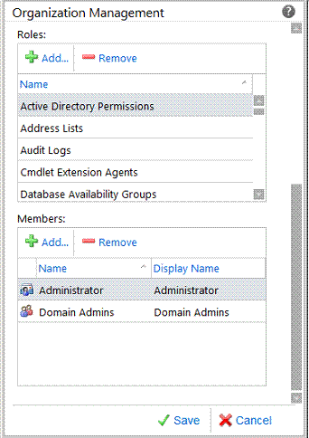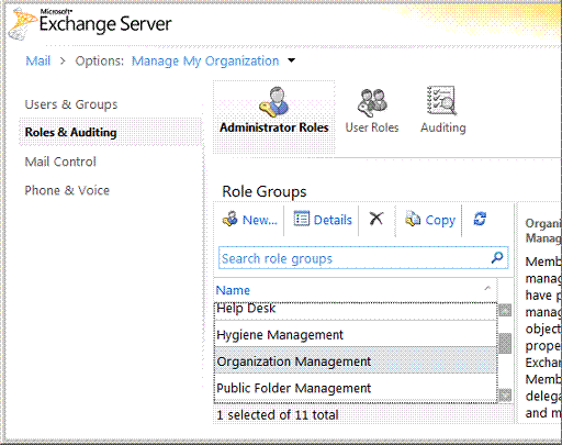 3. From here move to Roles & Auditing | Administrator Roles. Scroll through the roles list and in turn open the Organization Management and Public Folder Management roles.