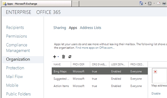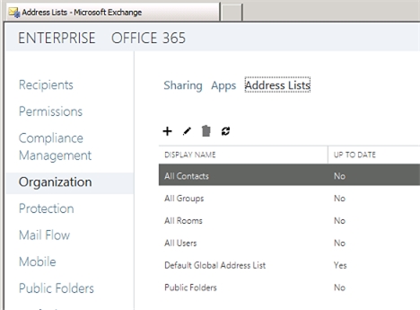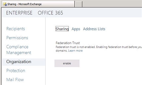 The Organization category includes Sharing, Apps and Address Lists. Sharing allows us to identify domains with whom we want to share free/busy data.