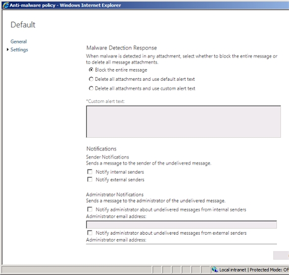 The Protection category brings the new Anti-malware options. To put this into context, I refer you to the announcement Microsoft made here: Important Changes to Forefront Product Roadmaps. Basically many of the Forefront products will be discontinued, including the on-premises Forefront Protection 2010 for Exchange (FPE).
