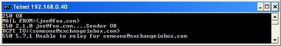 Let say I want to send an email to: someone@exchangeinbox.com. I will try to relay this through adminstop.com. I would submit the following command sequence: