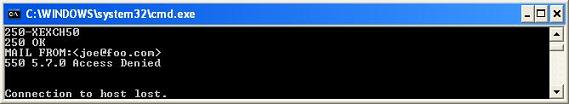 Sender Filtering blocks emails based on the SMTP MAIL address. I now added joe@foo.com to the sender block list. Here is my SMTP command sequence: