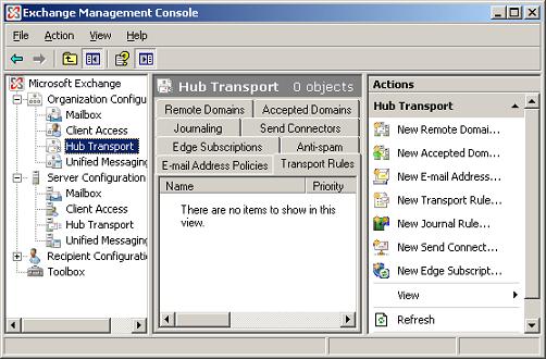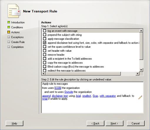 From the Actions pane click New Transport Rule to start the configuration wizard. Those accustomed to the Outlook Rules Wizard will immediately feel comfortable. The logic is the same, except that transport rules are tailor made for server side processes.