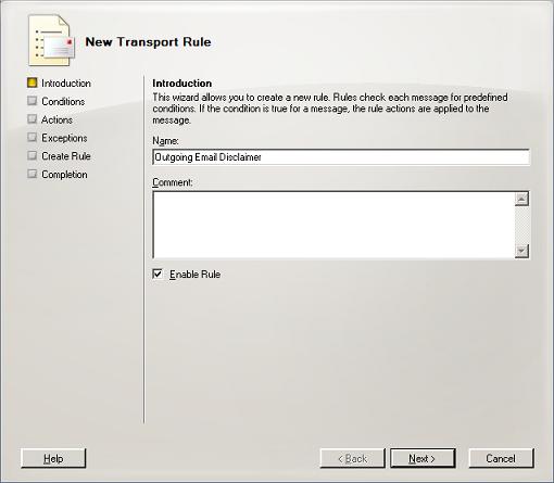 The first step requires a rule name, an optional comment and the initial rule enablement status. We name this 'Outgoing Email Disclaimer' and move on.