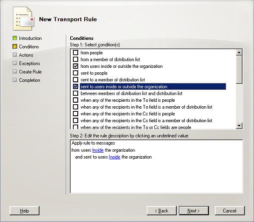 Next we select the conditions that will identify the emails to be processed. This is done by ticking the checkbox of relevant conditions. Selected conditions are added to the bottom pane. From here these are customized by clicking on the blue links. If we wanted to add the disclaimer to all emails, we would have not selected any conditions. However we will only add a disclaimer to outgoing emails. Thus we select the conditions 'from users inside or outside the organization' and 'sent to users inside or outside the organization'.